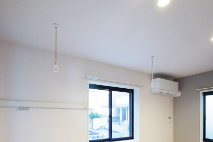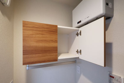 タオルや洗剤の収納に便利な吊戸棚の下にも、ハンガーがかけられるスペースを確保。