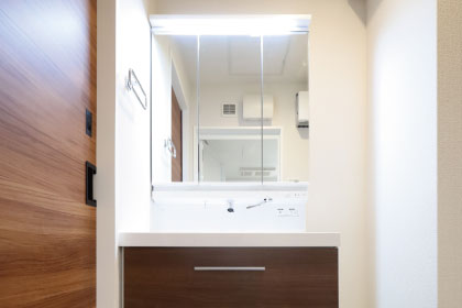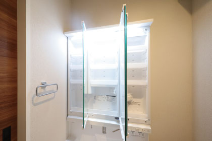 三面鏡の裏側には収納棚を確保。スキンケア用品やヘアケア用品などをすっきり整理できます。