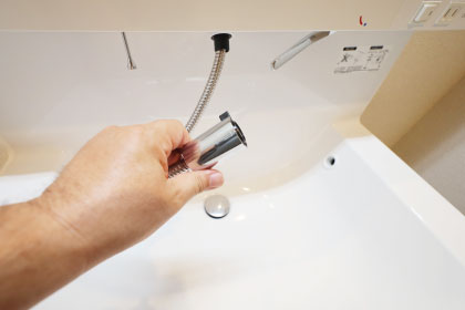 浴槽に手を入れずに、浴槽の縁の排水栓を一押しするだけで排水できます。