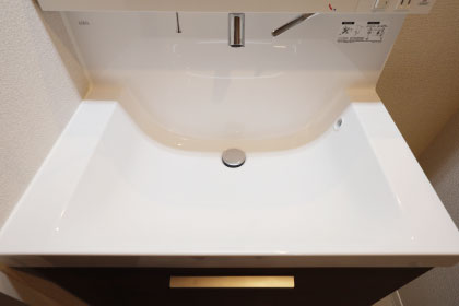 継ぎ目のない美しさと小物が置ける、カウンター一体型のボウル。お手入れのしやすいスクエアタイプを採用。